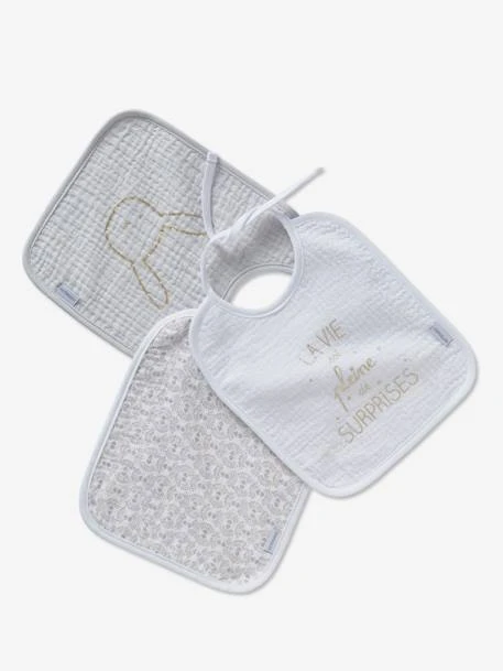 3 adorables bavoirs en gaze de coton délicat qui protègeront les habits de vos enfants lors des repas !